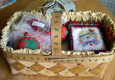 Like many crafters, my craft obsession is all inclusive, so although I concentrate on paper crafts I also enjoy other types of crafts.Years ago I was given the basket shown above as a gift, and it has since been my sewing basket. I mostly use if for cross stitching but also for small mending projects. I love the basket because it's functional yet cute enough to sit out to be enjoyed. If you know me at all you know that cute is an important factor when I'm chosing items such as decor, cars, organizational containers, etc.